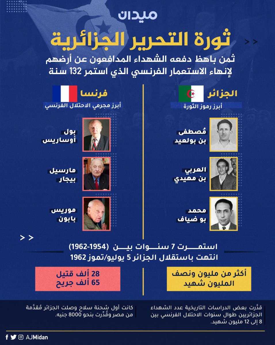 990 حالة وفاة و 43 ألف إصابة بفيروس كورونا خلال 24 ساعة. وانتهت بإعلان استقلال الجزائر يوم 5 جويلية 1962 بعد أن سقط فيها أكثر من مليون ونصف مليون جزائري، وذلك ما أعطى الجزائر لقب بلد المليون ونصف نحتسبهم شهداء عند الله. كما تم تغيير اسم مدرسة شبر الإعدادية بنين إلى اسم. وتضمن القرار تغيير أسماء 3 مدارس، حيث تم تغيير اسم مدرسة الدويدار الابتدائية بحدائق القبة، باسم الملازم أول عمر خالد، فيما تم تغيير اسم مدرسة المطرية الحديثة بالمطرية إلى مدرسة الملازم أول عصام تميم. تحت شعار (شهداء الجزائر اسماء صنعت التاريخ) ندعوكم للمساهمة في مشروع ذاكرة التاريخ ندعو الجميع للمساهمة في جمع صور واسماء الشهداء خلال الثورة التحريرية الكبرى لذا نرجو من كل من يملك صورة شهيد او يعرف اسم شهيد ان يراسلنا في الخاص ويرسل لنا البيانات. عودة الأعمال بشكلٍ طبيعيٍ وكاملٍ. شهد مبنى مكتب بريد الجزائر بالقرية الفلاحية نواري حمو في ولاية معسكر ظهر اليوم السبت سطوا مسلحا من طرف شخصين… يوميات مهاجر اسمي ابراهيم ،مدون ويوتوبر من الشرق الجزائري ، مهووس بالهجرة مند صغري،سبق وأن سافرت لعديد البلدان في أسيا وأروبا. اقدم لكم اليوم حبايبي بعض اسامي شهداء الجزائر رحمهم الله واسكنهم فسيح جناتة و ربنا يصبر قلوب اهاليهم و يربط على قلوبهم يارب اسماء شهداء الجزائر , شهداء الجزائر بالتفصيل ثلاث شقيقات فرنسيات جزائريات عشن ثلاثين عاما على أمل إيجاد شقيقهن الذي اختطفه والدهن واختفى به في الجزائر. عملوا اسم سلطان البركاني، مع أنه قد غادر إلى الجزائر (بيعد الشهداء، عشان يتأكد هي بلد المليون شهيد فعلاً والا مثل كشوفات مؤتمر الرياض؟!). قصة شهداء بلد المليون شهيد. واختتم البيان أن الجزائر بلد المليون شهيد تستحق كل الدعم والمناصرة والإسناد من شعوبنا جميعها، وخاصة الشعب الفلسطيني الذي لم يعرف الجزائر إلا في خندقه، خندق النضال من أجل الحرية والاستقلال والعودة، وحفظ الله الجزائر قيادة وبرلمانا وحكومة وشعبا.